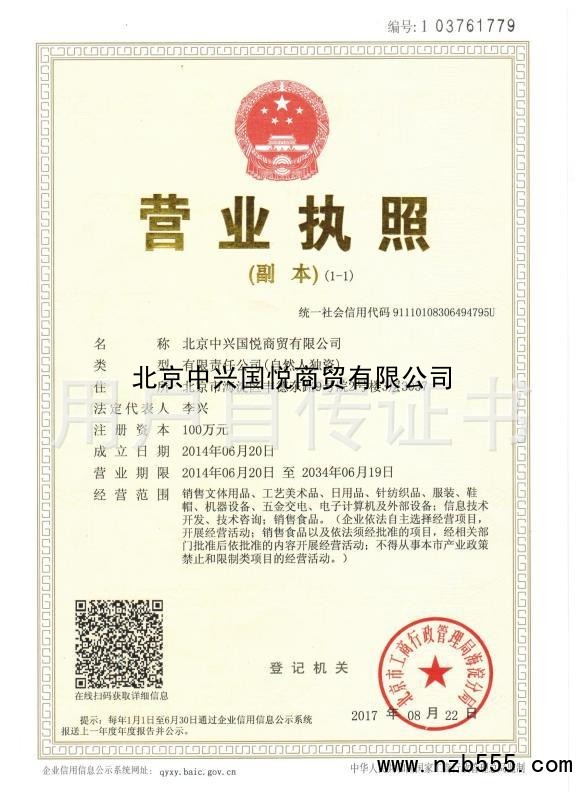 | 發(fā)證機(jī)構(gòu): | 北京市工商行政管理局海淀分局 | 發(fā)證時(shí)間 : | 2017-08-22 |