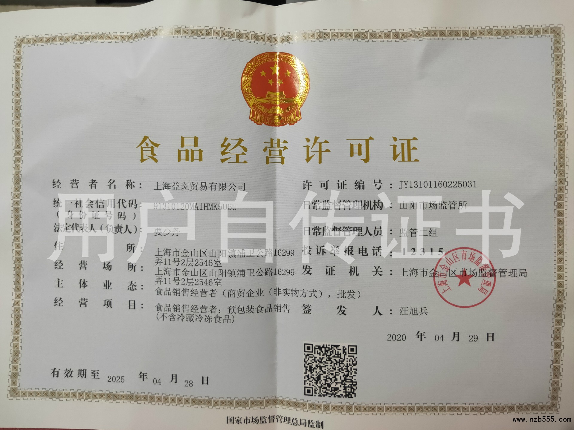 | 發(fā)證機(jī)構(gòu): | 上海市金山區(qū)市場監(jiān)督管理局 | 發(fā)證時間 : | 2020-04-29 |
