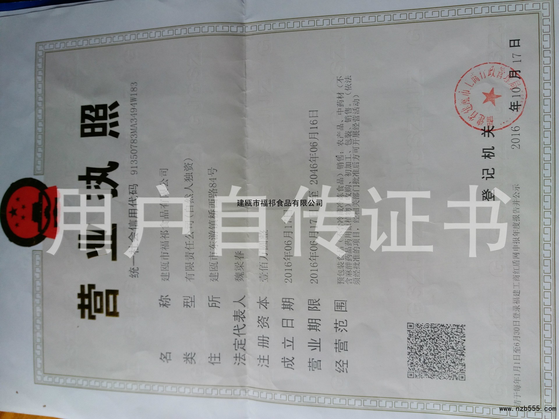 | 發(fā)證機(jī)構(gòu): | 福建省建甌市工商行政管理局 | 發(fā)證時(shí)間 : | 2016-10-17 |