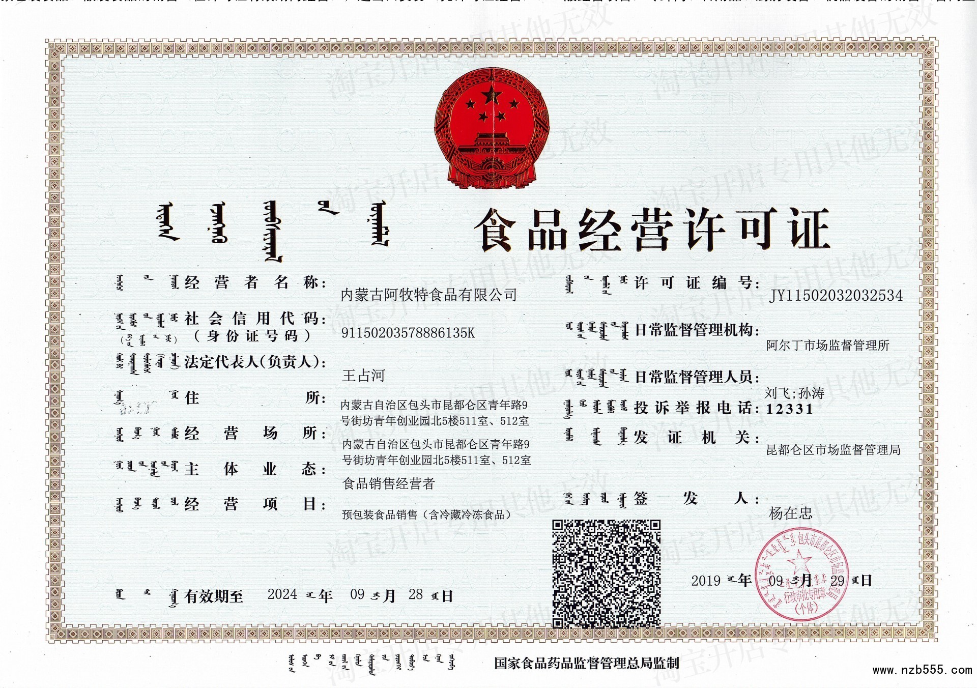 | 發(fā)證機(jī)構(gòu): | 包頭市昆都侖區(qū)市場監(jiān)督管理局 | 發(fā)證時間 : | 2019-09-29 |