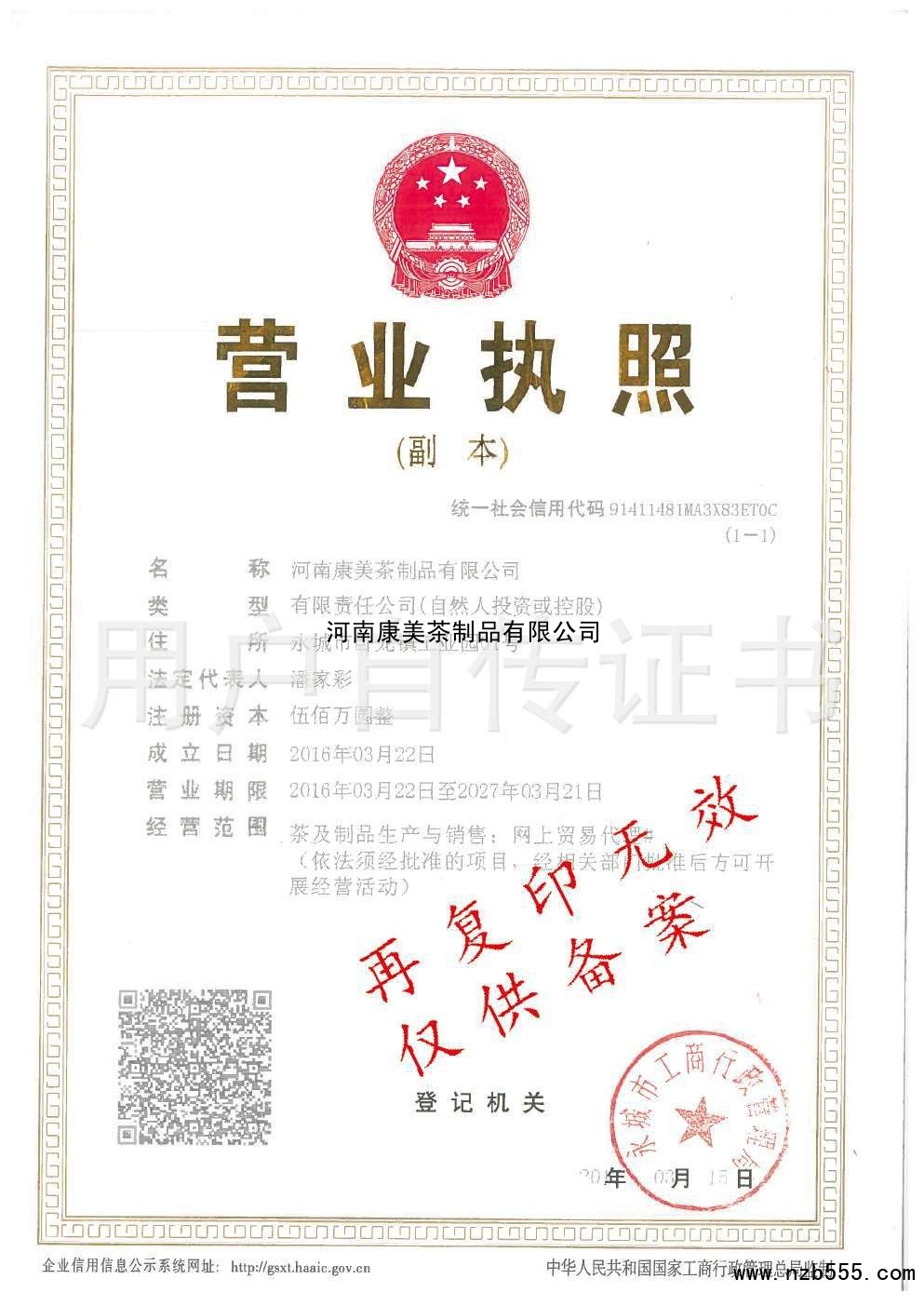 | 發(fā)證機(jī)構(gòu): | 永城市工商行政管理局 | 發(fā)證時(shí)間 : | 2015-03-18 |