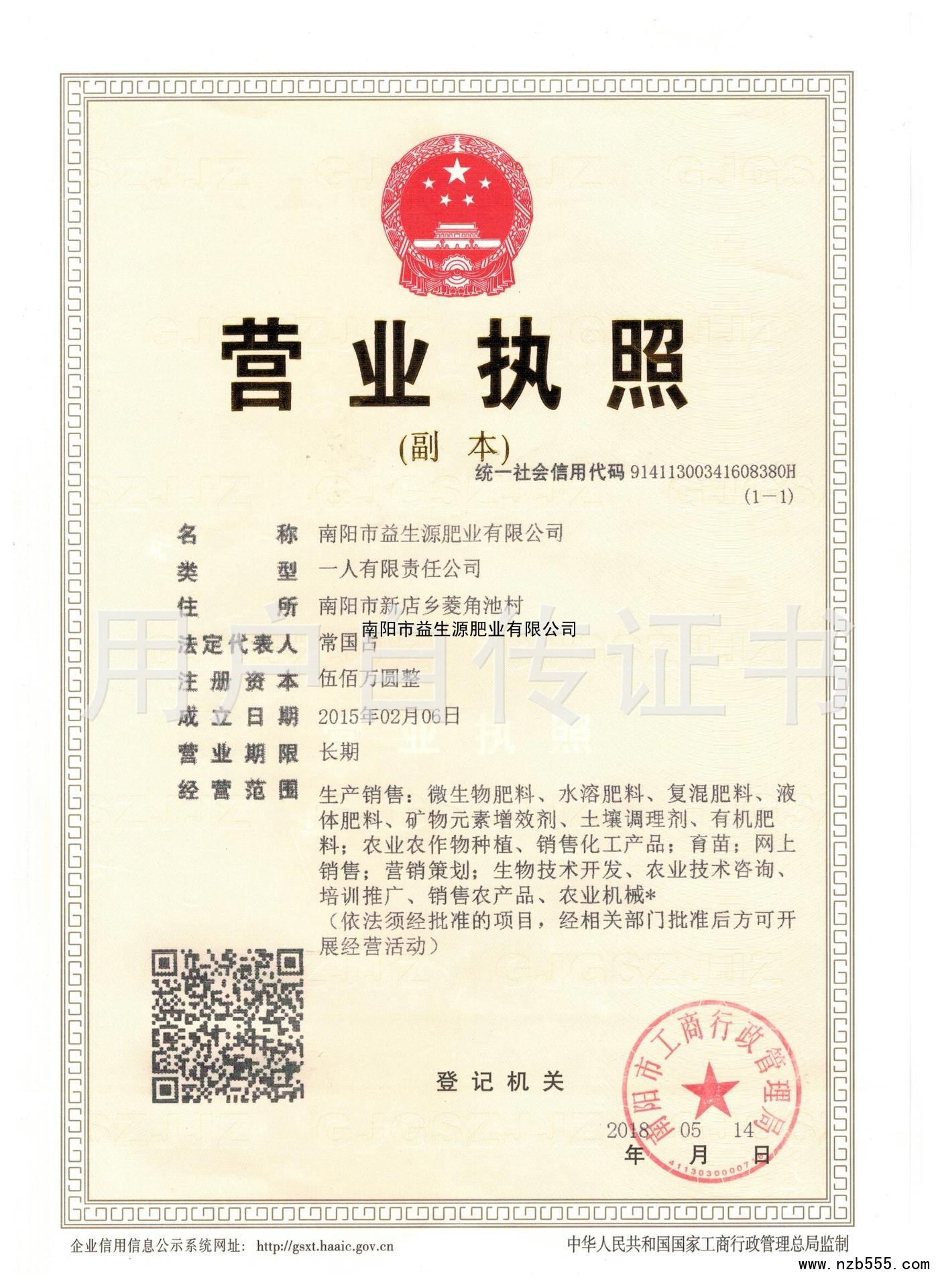 | 發(fā)證機(jī)構(gòu): | 南陽市工商行政管理局 | 發(fā)證時(shí)間 : | 2018-05-14 |