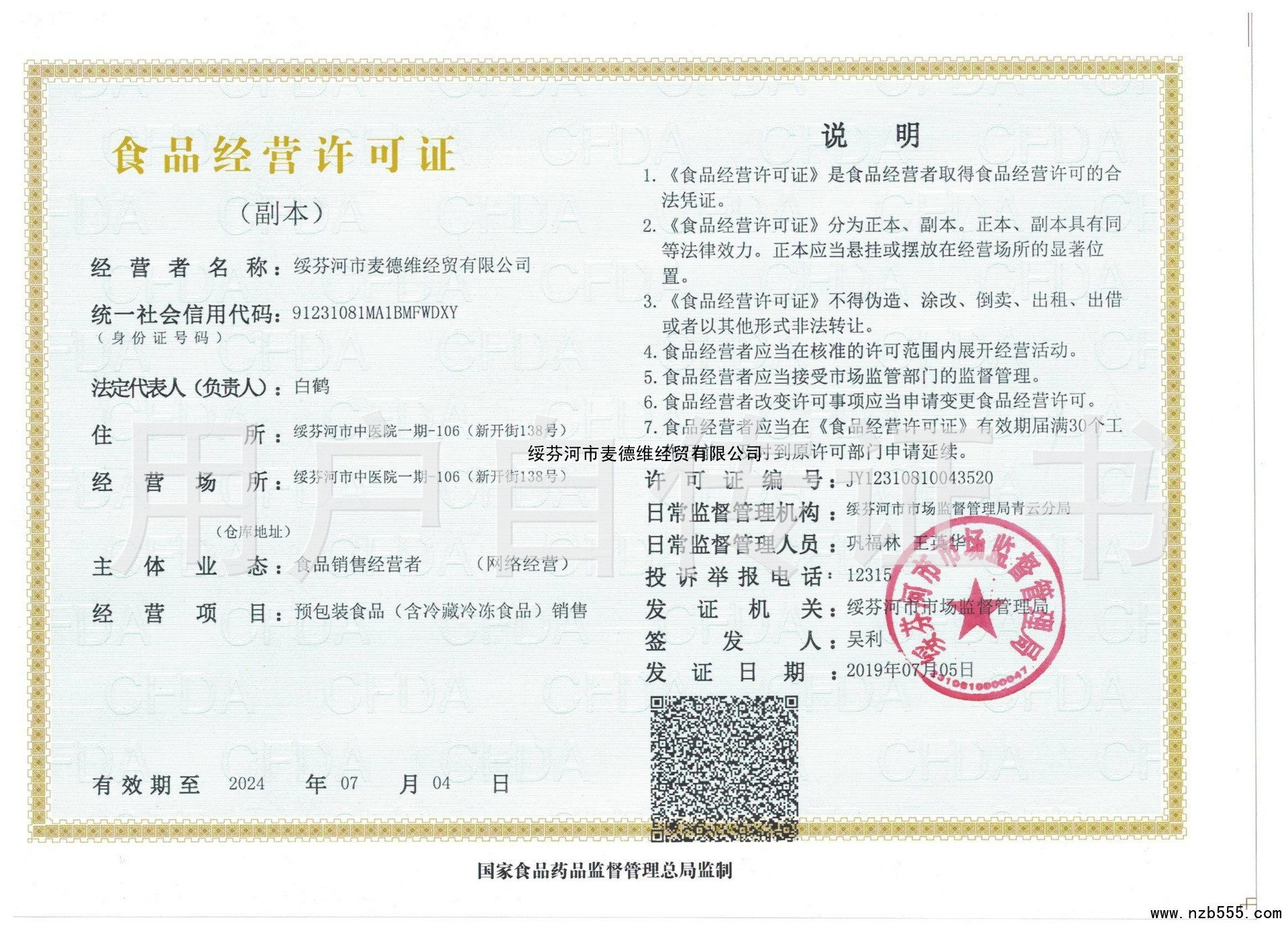 | 發(fā)證機(jī)構(gòu): | 綏芬河市市場(chǎng)監(jiān)督管理局 | 發(fā)證時(shí)間 : | 2019-07-05 |