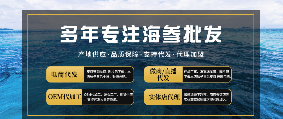樂陶海參起源于山東煙臺沿海漁村,傳承父輩對海參的傳統捕撈,加工,銷售至今。隨海參需求市場對品質要求不斷提高,樂陶海參的品種工藝也與時俱進,多樣化。現主營國內外淡干海參、國標特級純淡、加拿大紅極參、即食、拉缸鹽暢銷市場。公司與多家零售商和代理商建立了長期穩定的合作關系。并承接客戶定制、代加工。公司秉承重信用、守合同、保質量,做優質海參供貨商為理念,以廠貨源頭、微利走量為宗旨,贏得更多多元化渠道代理商,一起合作共贏。 [