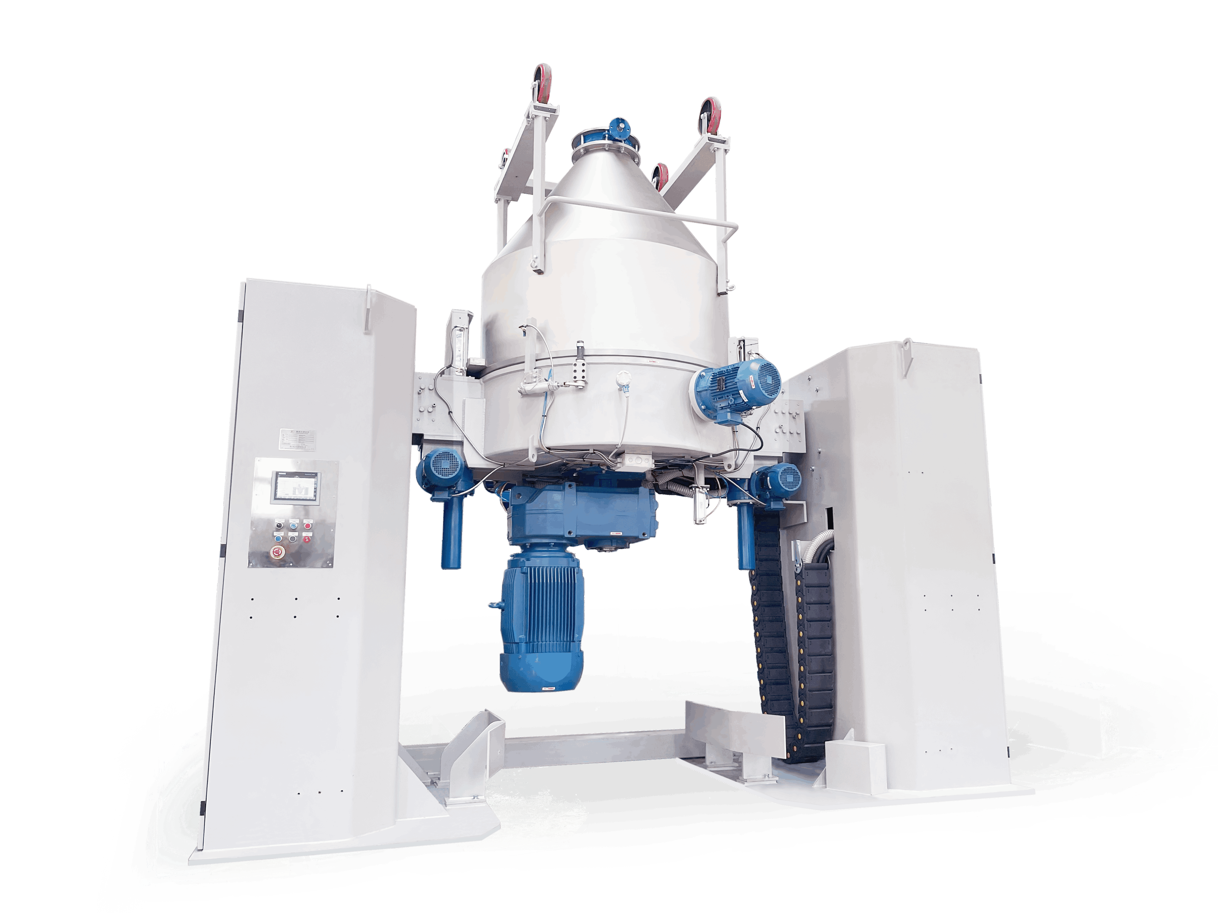LCM系列混合機采用可移動式料斗,適用于各種粉末及粒狀材料的混合攪拌。裝有待混合原料的料斗推到工位后,自動控制系統將其提升,與攪拌頭(可配置冷卻水套)安全鎖定。料斗與攪拌頭一起翻轉 180 度,在攪拌槳和破碎輪的作用下,完成對物料的攪拌和混合?;旌贤瓿珊?,料斗自動回到原工位,與攪拌頭分離。