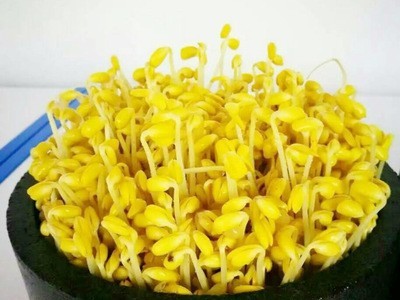 小金黃芽豆,因?yàn)轭w粒比正常黃豆小很多,也被稱為珍珠芽豆,生產(chǎn)加工的規(guī)格標(biāo)準(zhǔn)是3.5mm-5.5mm。上面是客戶發(fā)芽后拍來的圖片。