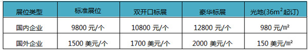 注:A. 標準展位配備:展位地毯鋪設、中英文雙語楣板字、咨詢桌一張、折椅兩把、射燈或日光燈兩個、220V插座一個。